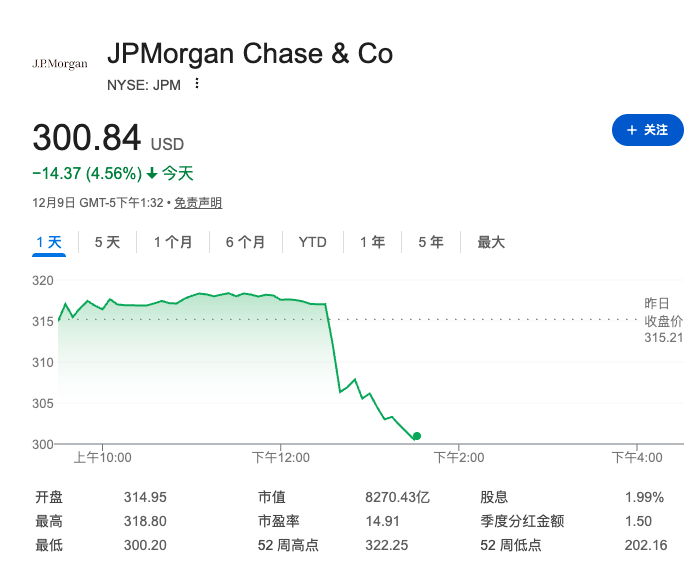 明年1050亿美元支出指引超预期,摩根大通盘中大跌近5%