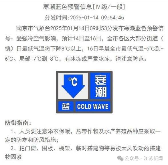 预警!预警!江苏今天中午开始! 作者:admin 发表于:1年前 (2025-01-15) 阅读:1 评论:0 国际 昨天 江苏各地最高气温普遍上升明显 淮北地区12-13℃ 其他地区14℃左右 降温马上就到! 南京市气象台2025年01月14日09时53分发布寒潮蓝色预警信号:受强冷空气影响,预计14日至16日,全市各区大部分街道(镇)日最低气温将下降8... Tags: 新农村 天气