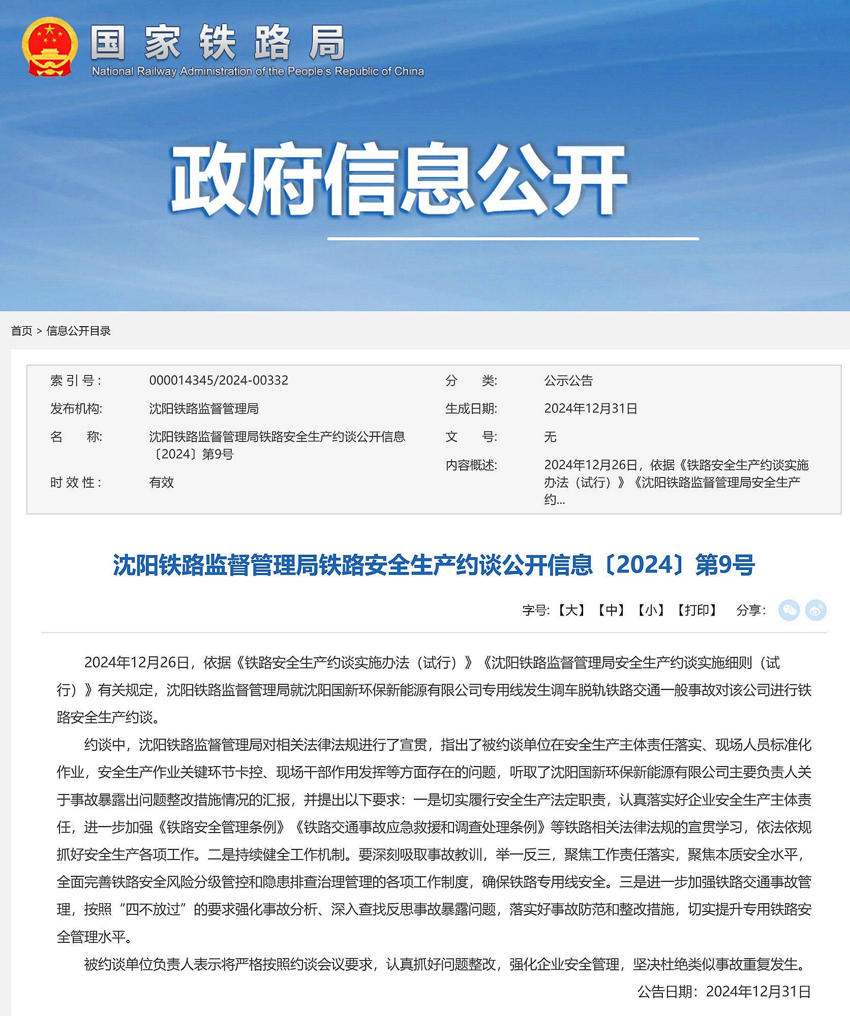 专用线发生调车脱轨事故,沈阳国新环保新能源有限公司被安全约谈 作者:admin 发表于:1年前 (2025-01-04) 阅读:1 评论:0 国际 沈阳铁路监督管理局铁路安全生产约谈公开信息〔2024〕第9号 2024年12月26日,依据《铁路安全生产约谈实施办法(试行)》《沈阳铁路监督管理局安全生产约谈实施细则(试行)》有关规定,沈阳铁路监督管理局就沈阳国新环保新能源有限公司专用线发... Tags: 养生 铁路事故 环保 环境保护 交通 时政 约谈
