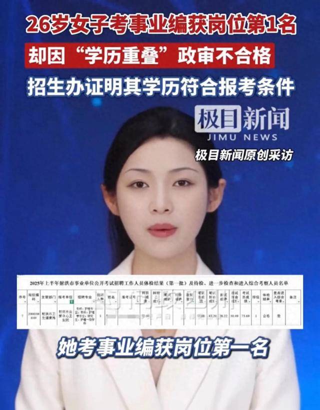 26岁女子考事业编获岗位第1名,却因“学历重叠”政审不合格 作者:admin 发表于:2个月前 (12-04) 阅读:0 评论:0 低空经济 近日,四川射洪市1999年出生的税女士在问政四川求助称,她参加2025年上半年射洪市事业单位考试,并获得医疗岗位综合成绩第1名的成绩,但在政审过程中因“中专与成人大专学历时间重叠”,被判定不合格。 税女士介绍,她中专于2015年-2018年... Tags: 奔驰汽车